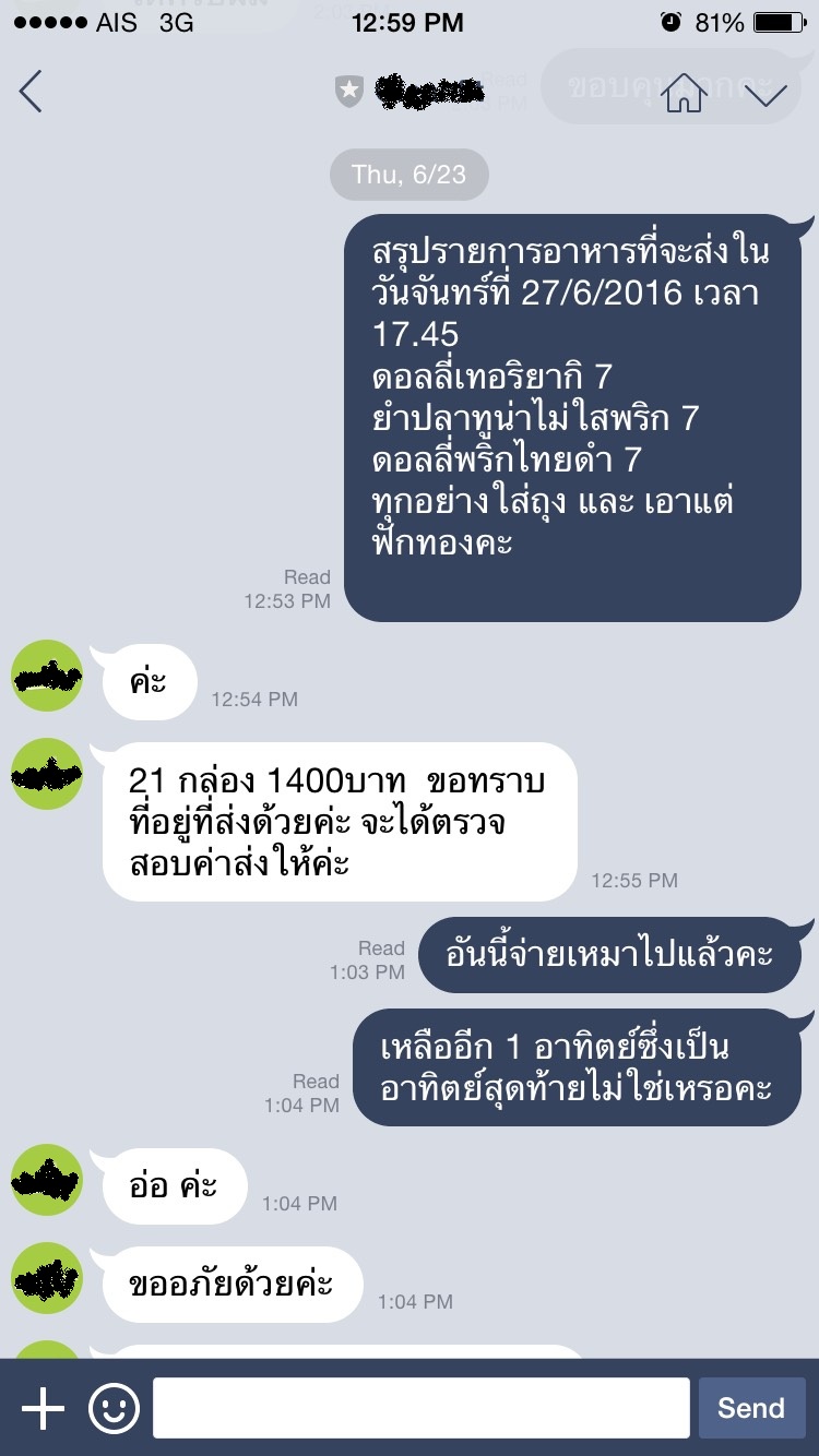 มามีครั้งสุดท้ายซึ่งก็มีการระบุทั้งอาหาร เวลา ในการจัดส่ง แต่ทุกอย่างยังผิดเลยอยากเตือนเพื่อนๆถ้าจะสั่งเป็นรายเดือนต้องระวังกันดีๆนะคะ