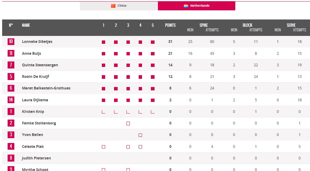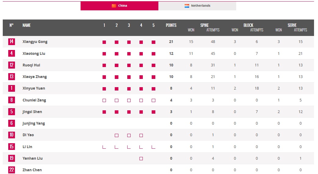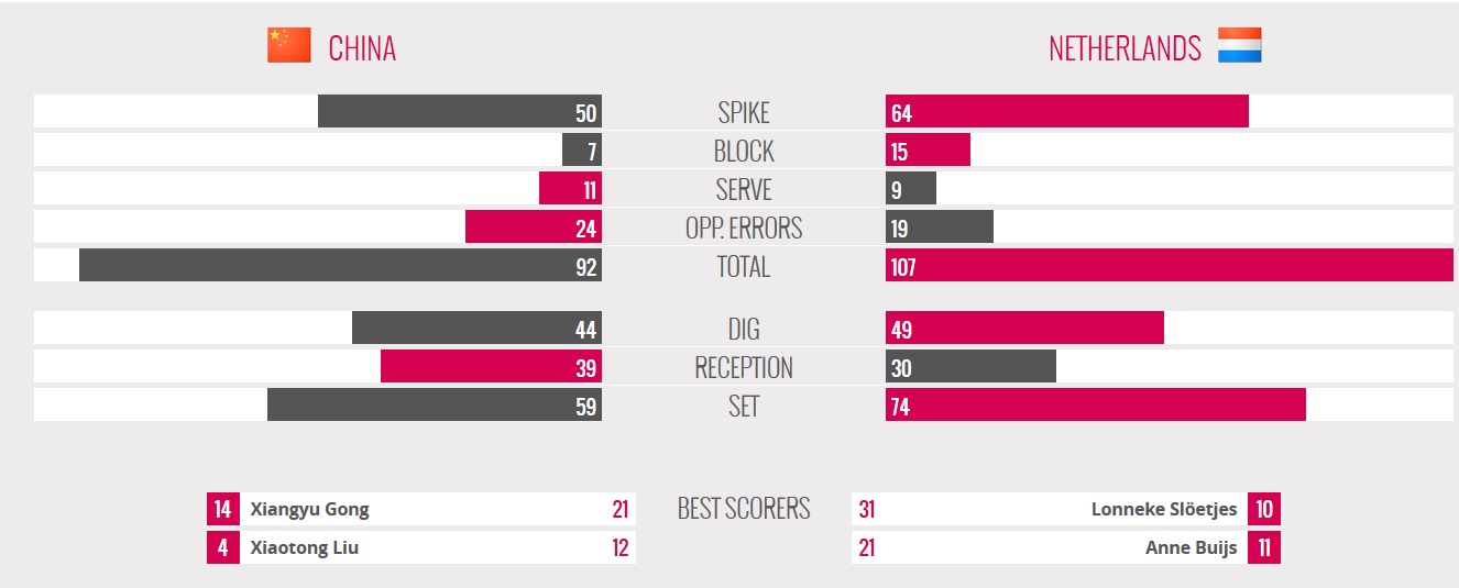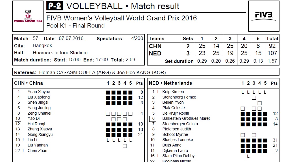 CHINA 3 : 0 NETHERLAND Set 1 - CHN 25 : 22 NED Set 2 - CHN 25 : 23 NED Set 2 - CHN 25 : 21 NED http://worldgrandprix.2016.fivb.com/en/group1/schedule/6935-china-netherlands/post