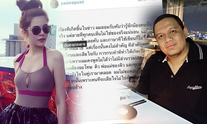 ที่สำคัญผมขอโทษและเสียใจกับการกระทำที่ทำให้เกิดเรื่องราวนี้ขึ้นมา เพราะผมคงพูดไม่ได้ว่าไม่มีส่วนร่วมเลยในเรื่องนี้ ผมต้องขอโทษ ดิว พ่อแม่ของดิว และทุกคนที่คอยให้กำลังใจในคู่เรามาตลอด ผมไม่ขอตอบโต้ใดๆ กับคนพวกนั้น เพราะคนที่จะเสียใจไม่ใช่ต้นเรื่อง แต่เป็นคนรอบข้าง"
