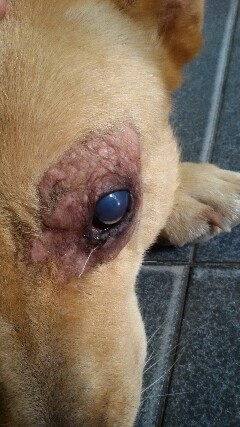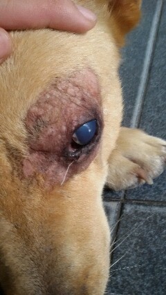 มันคือหมาที่ทำงาน ไม่มีคนดูแล มันโดนหมาตัวอื่นกัดที่ตา เมื่อปีที่แล้ว และไม่ได้รักษา นอกจากทายาแบตาดีน (เรียกถูกมั้ย ยาขวดสีเหลือง)