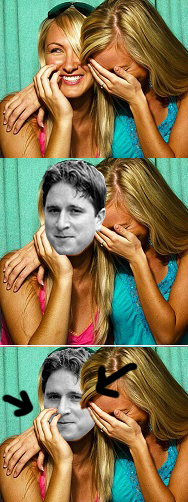 นิ้วของผู้หญิงกับผมของคนด้านข้างบังภาพที่แทรกเข้าไปอยู่ในช่องที่2