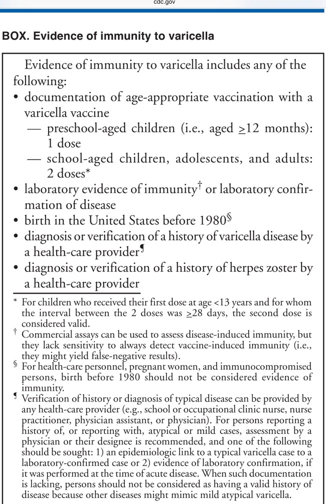 ( บางที่จะถือเอาประวัติการเคยเป็นอีสุกอีใสหรือเคยเป็นงูสวัดที่ได้รับการวินิจฉัย"โดยแพทย์" ก็ถือว่าได้เช่นกัน )