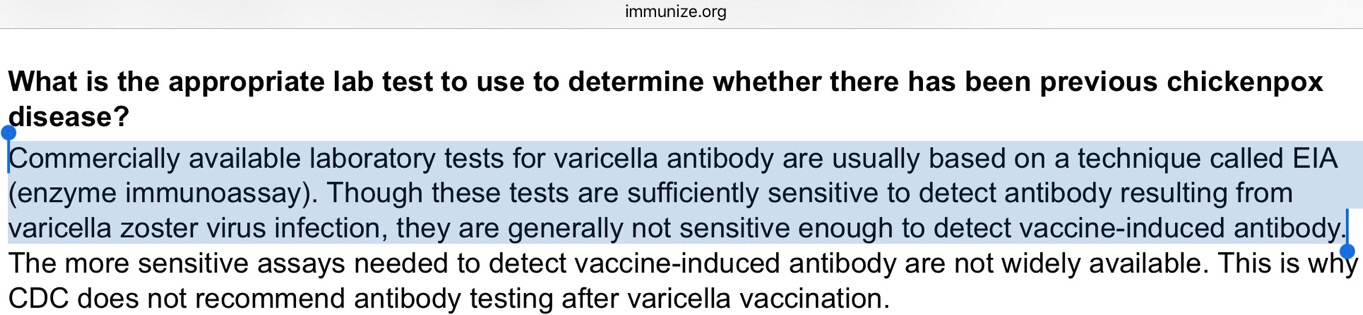 จึงเป็นเหตุผลที่ทาง CDC ไม่แนะนำให้ตรวจภูมิว่ามีหรือไม่หลังฉีดวัคซีนป้องกันอีสุกอีใส