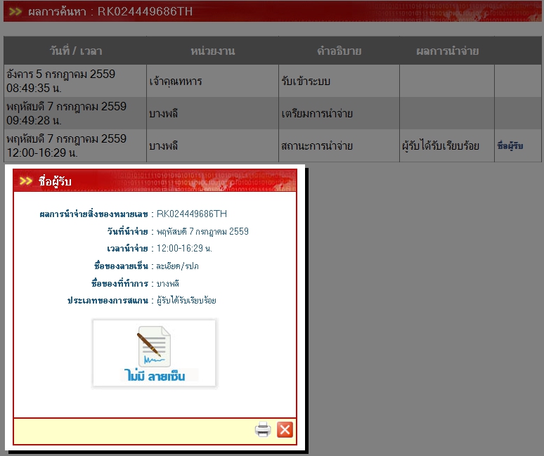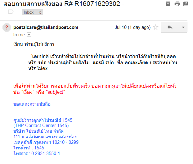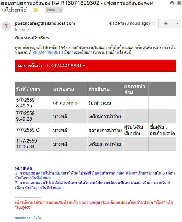 ไม่กี่ชั่วโมงถัดมา ไปรษณีย์ไทยส่งเมลมาดังนี้ ซึ่งเร็วเหลือเชื่อ ไม่นึกว่าทำงานวันอาทิตย์ด้วย