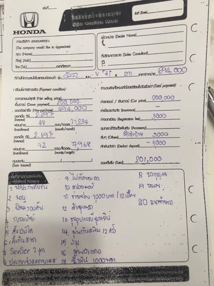 พอดีจะซื้อรถ Honda Jazz S AT ราคา 594,000 ดาวน์ 25% ผ่อน 72งวด ดอกเบี้ย 2.39 ค่ะ เจรจากับเซลล์ว่าต้องการส่วนลดเงินสดมากกว่าของแถม ที่ได้คือดังนี้ 1. ประกันภัย (วิริยะ) 2. พรบ. 3. ฟิล์ม Hi kool หรือ L