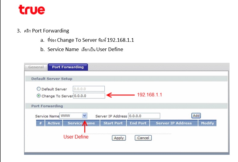 ขอวิธีตั้งค่า forwarding port ของ True gigatex T626 PRO ครับ