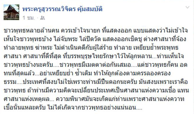 "อย่าลืมว่าวัดร้างนั้นเป็นวัดของบรรพบุรุษชาวพุทธ เป็นของชาวพุทธโดยชาวพุทธ และก็เพื่อชาวพุทธเท่านั้น จะพยายามให้กลับไปเป็นวัดร้างอีกรอบใช่หรือไม่"
