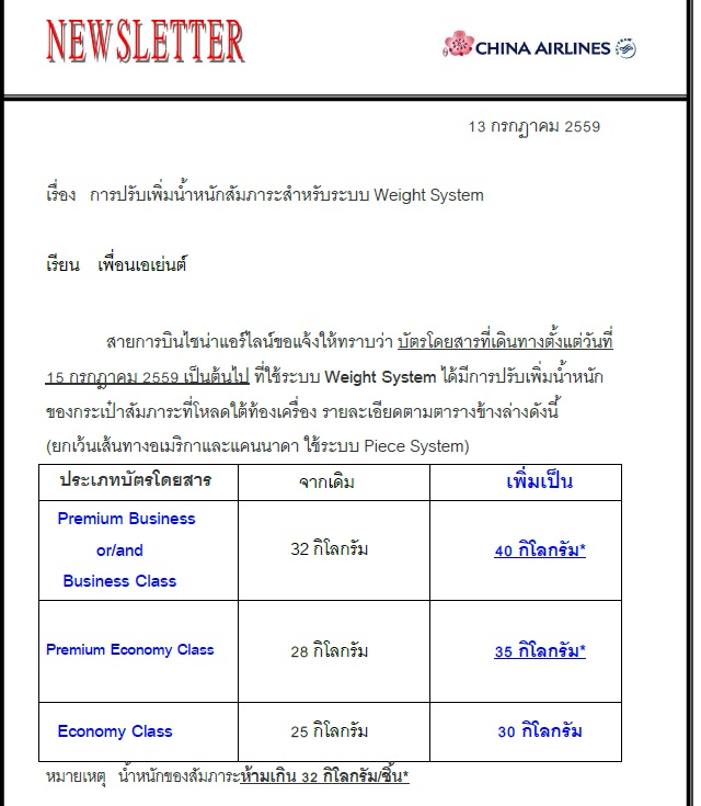 China Airlines แจ้งปรับน้ำหนักสัมภาระเพิ่ม สำหรับระบบ Weight System