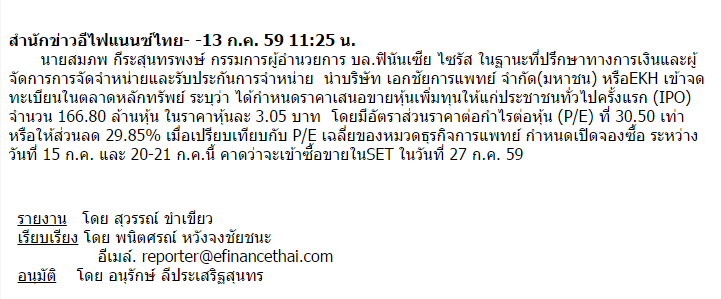 EKH เคาะราคาIPO ที่ 3.05 บ./หุ้น จองซื้อ 15และ20-21 ก.ค. นี้ เข้าเทรด ในSET 27 ก.ค.59