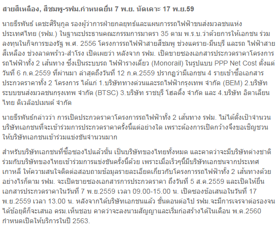 4 เอกชนซื้อซองโมโนเรล สายสีเหลือง (ลาดพร้าว - สำโรง) และสีชมพู (แคราย - มีนบุรี)