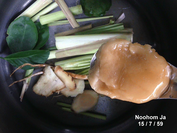2. นำหม้อที่จะต้มไก่มาวางบนเตาไฟ ใส่ ข่า ตะไคร้ รากผักชี ใบมะกรูด น้ำตาลปิ๊บ ลงไปก้นหม้อ