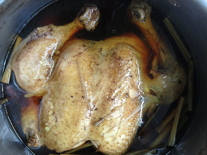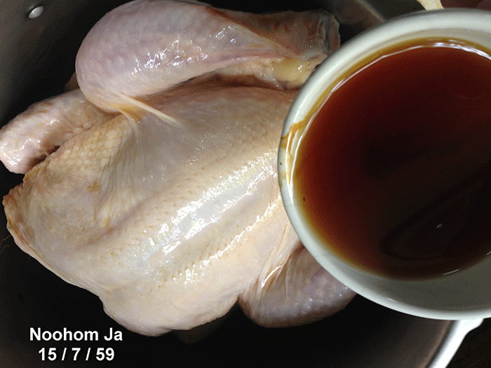 ซีอิ้วดำลงบนตัวไก่ สุดท้ายตามด้วยน้ำสำหรับต้มพอท่วมไก่