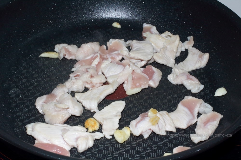 2.ใส่เนื้อหมูลงไปผัดให้พอสุก