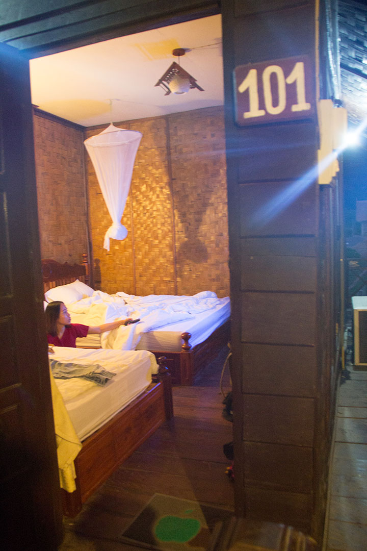เดินๆ หาที่พัก และเราก็ได้พักกันที่นี่ คืนนี้ 200,000 กีบครับ เงินไทยก็ 870 บาท นอนกัน 3 คน หาร 3 ครับ