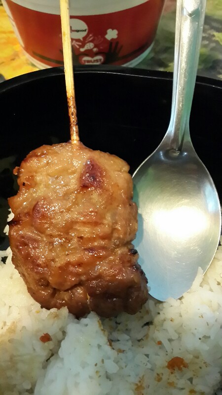 แม่ค้าหยิบหมูมาปิ้งเพิ่ม แล้วดึงออกไม้ละชิ้น ในถ้วยคือหมูที่ถูกดึงออก เป็นหมูที่แพคขายส่งตามที่เราทานๆกันหลายๆที่ ขณะถ่ายรูปแม่ค้าก็มองครับ ไม่ได้ปิดเสียงชัตเตอร์ แต่ผมไม่สนใจ
