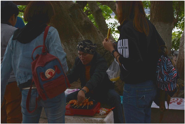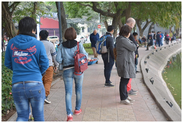 พวกเราแวะกันตรงที่มีสะพานแดงๆ แล้วก็วัดเนินหยก หรือหง็อกเซิน (Ngoc Son Temple) ระหว่างที่เดินก็ซื้อของกินค่ะ 555 ทั้งไส้กรอก ทั้งผลไม้ที่เหมือนจะดองมั้งคะ อ่าๆๆ แล้วก็คลุกกับอะไรสักอย่างเหมือนพริกเกลือที่บ้านเราเอาไว้จิ้มผลไม้นั่นแหละค่ะ ชุดนึงก็ 30 บาทได้ค่ะ