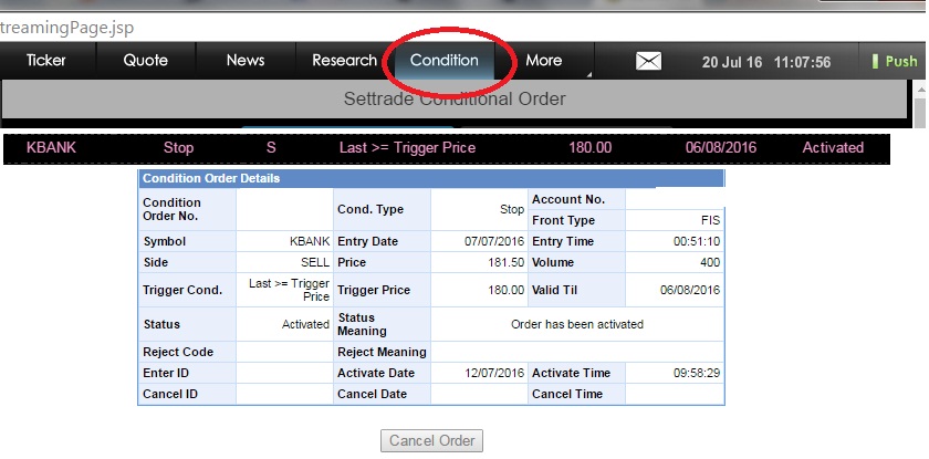 จากรูป ผมตั้งเงื่อนไขแบบ stop order ถ้าราคาล่าสุดมากกว่า 180 ให้ตั้งขาย 181.5 บาท จำนวน 400 หุ้น สถานะก็ active แล้ว ระยะเวลาผมก็ตั้งให้ทำงานถึงเดือนสิงหา