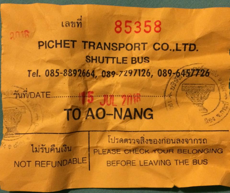 หลังจากลงเครื่อง เราก็ต้องไปต่อ Shuttle bus ไปอ่าวนางค่ะ สามารถซื้อตั๋วได้ที่ประตูทางออกสนามบินแล้วขึ้นรถได้เลยนะคะ