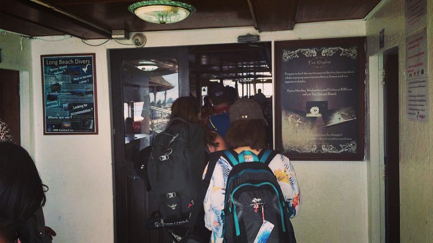 ขึ้นเรือแล้วรีบหาที่วางกระเป๋ารวมกับของนักท่องเที่ยวคนอื่นๆ แล้วหาที่นั่ง เรือมีสองชั้นค่ะ ชั้นบนและชั้นล่าง จะมีเบาะให้นั่ง มีแอร์เย็นๆ