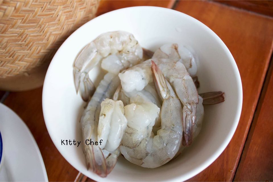 กุ้งสดนำมาแกะเปลือก ผ่าหลังแล้วล้างให้สะอาด