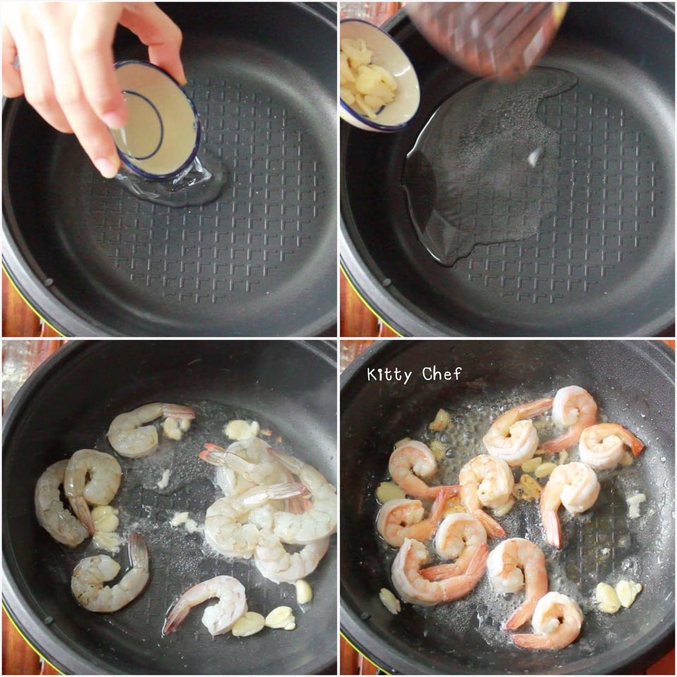 ตั้งกระทะ เทน้ำมันเจียวกระเทียมพอมีกลิ่นหอม ใส่กุ้งสดผัดพอสุก