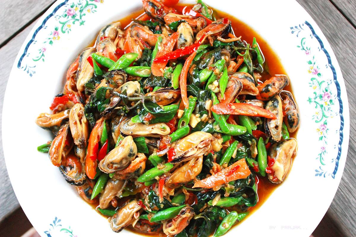 " หอยแมลงภู่ผัดใบโหระพา "