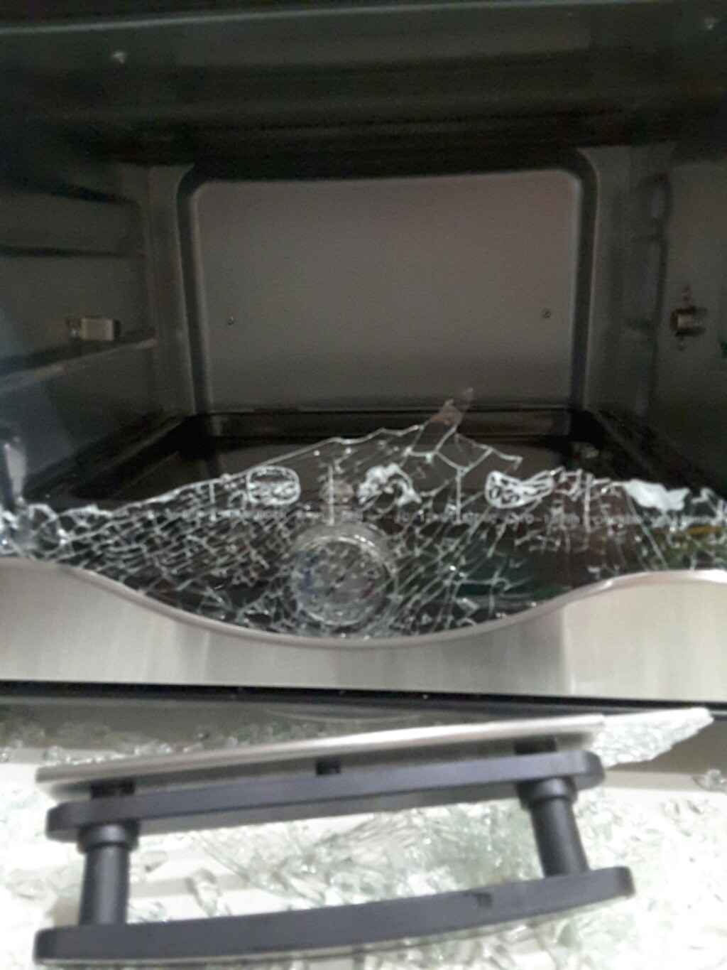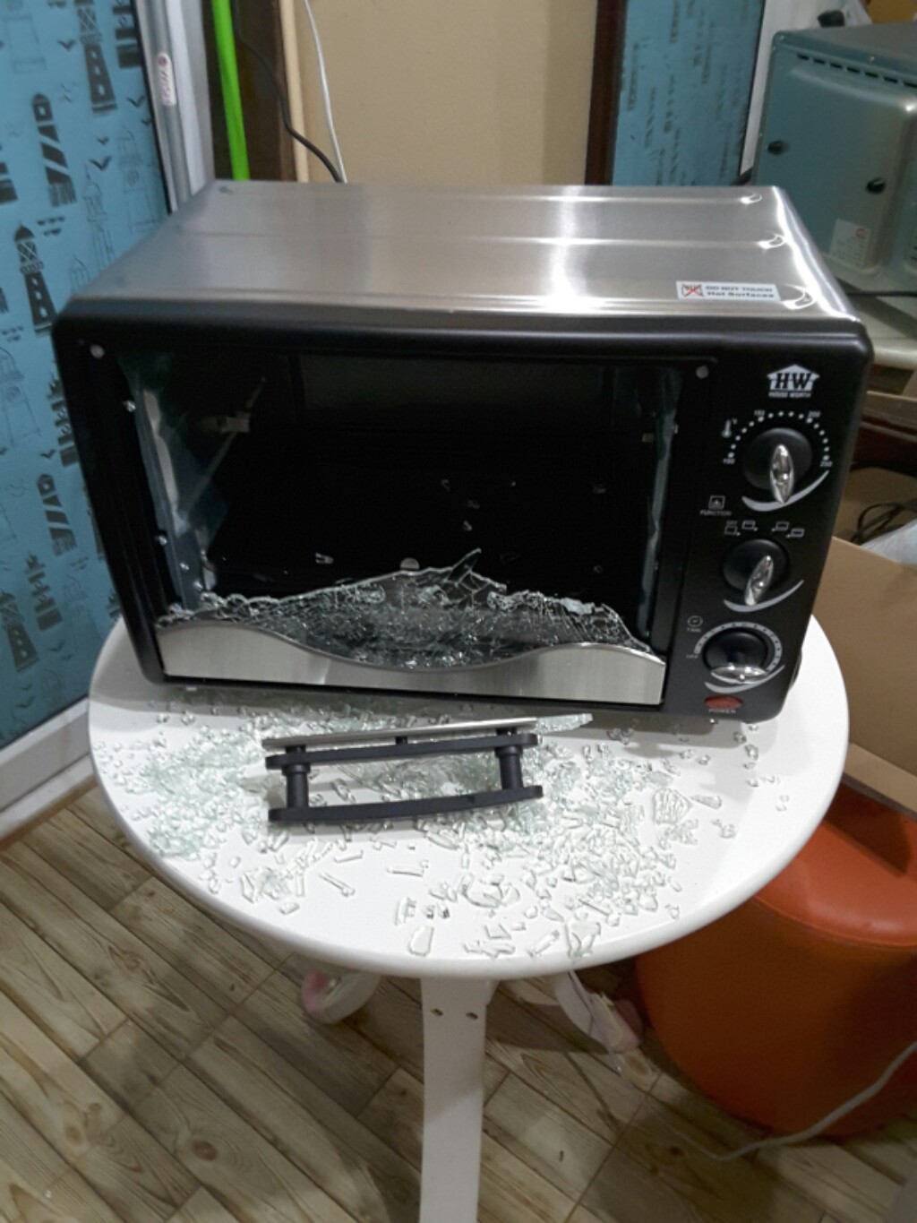 แบบ....ดังมากค่ะ เราหันไปดูเตาอบ ตกใจมาก เห็นบานกระจกของเตาอบแตกกระจาย