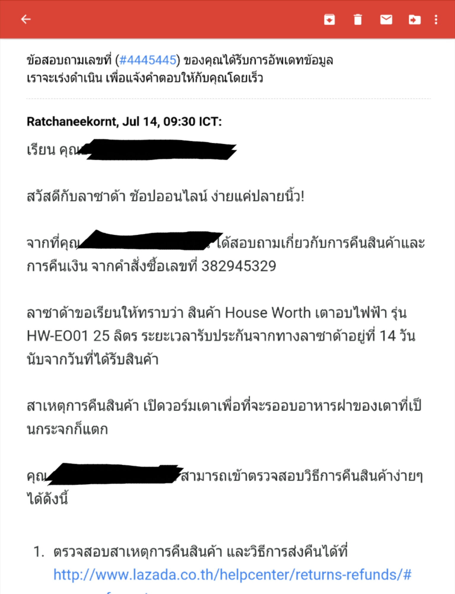 อันนี้ไม่แน่ใจว่าทางลาซาด้า เตะถ่วงเวลาหรือยังงัย? มีอะไรก็รีบแจ้งกับทางลูกค้าด้วยค่ะว่าจะเอายังงัยต่อ? จะรอให้หมดเวลารับประกัน14วันเหรอ?