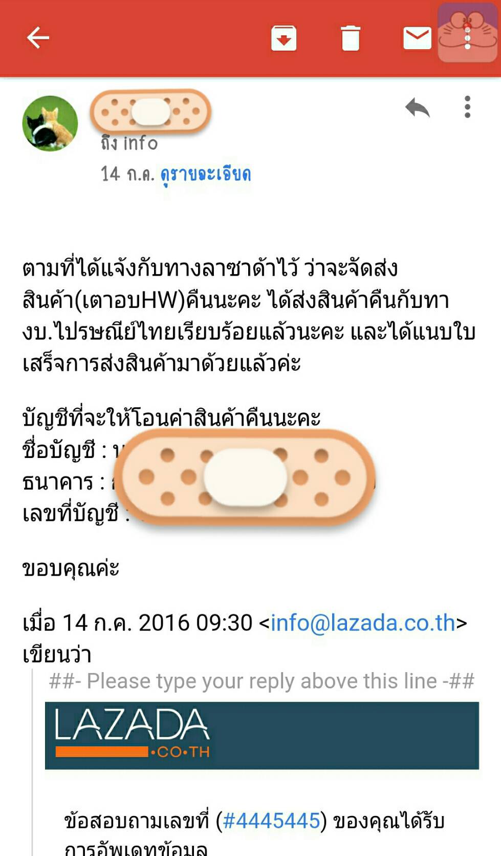 ทีนี้วันที่14/7/59 เราได้คุยกับCC ลาซาด้า ว่าจะส่งสินค้าคืน และทำเรื่องคืนเงินเรา จนท.ก็ให้ส่งเตาอบกลับ เราก็ส่งกลับเรียบร้อย