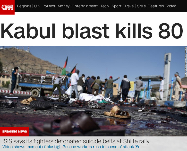 กลุ่มนักรบรัฐอิสลาม (ไอเอส) ซึ่งมีเครือข่ายอยู่ในอัฟกานิสถานด้วยเช่นกัน นอกเหนือจากในอิรักและซีเรีย ออกมาอ้างตัวว่าเป็นผู้อยู่เบื้องหลังเหตุระเบิดฆ่าตัวตาย 2 ครั้งซ้อนกลางเมืองหลวงของอัฟกานิสถานในครั้งนี้ ซึ่งเกิดขึ้นในขณะที่มีการเดินขบวนประท้วงของสมาชิกชนกลุ่มน้อยมุสลิมชีอะห์เผ่าฮาซารา จำนวนหลายพันคนต่อโครงการพัฒนาโครงข่ายไฟฟ้าของรัฐบาลอัฟกัน