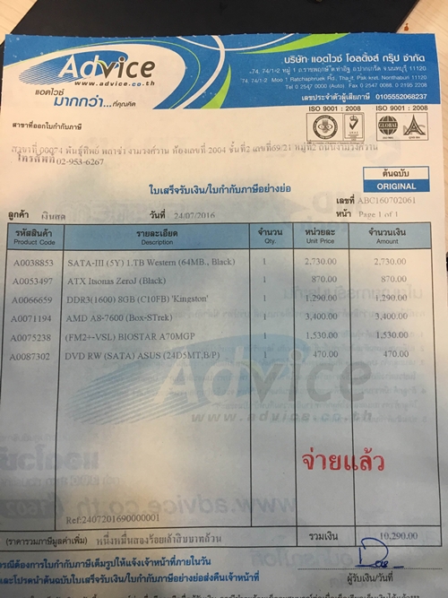ผมได้ทำการเข้าไปซื้อคอมพิวเตอร์แบบประกอบ ที่ร้าน Advice สาขานี้ ผมก็แจ้งพนักงานไปว่า ต้องใช้การงานประเภทใด เบื้องต้นพนักงานก็แนะนำนู่น นี่ นั่น ต่าง ๆ จนได้สเปคและราคาตามที่ต้องการ จากนั้นก็ไปชำระเงินเป็นจำนวน [ตามภาพ] พนักงานแจ้งว่ารอประมาณ 2 ชม (ประกอบเครื่อง+ลงซอฟแวร์)