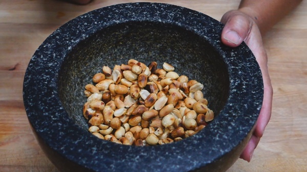 เอาถั่วลิสงมาคั่ว ลอกเปลือกออก แล้วก็ใส่ครกตำค่ะ ถั่วแนะนำว่าทำแต่พอทานค่ะ ถ้าทำเยอะเหลทอเก็บไว้จะเหม็นหืนต้องทิ้งเสียของเปล่า ๆ นะคะ ทำแต่พอทานในมื้อที่เราจะทำค่ะ หอมมากเวลาตำ