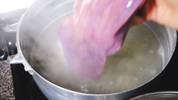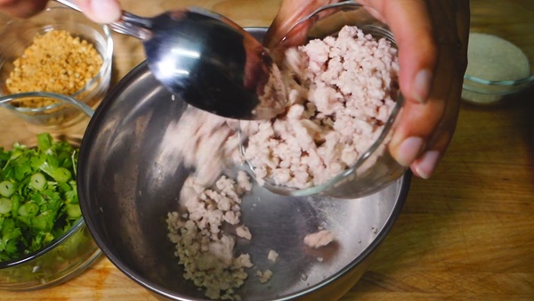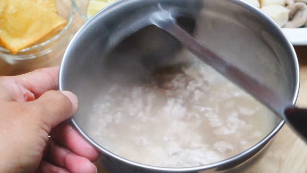 แล้วก็นำหมูสับมาลวกค่ะ ตาใช้ใส่หม้อเล็ก ๆ หรือ ถ้วยก็ได้ค่ะ แล้วตักน้ำซุปที่ต้มไส้ไว้เดือด ๆ มาใส่ในหมู แล้วก็คน ๆ ให้หมูสุก รินน้ำออก พักไว้ก่อนค่ะ