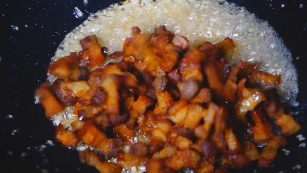 แล้วก็มาเจียวกระเทียม กากหมูหอม ๆ กรอบ ๆ กัน ตาเอาหมูสามชั้นมาเจียวในกระทะจนได้น้ำมันหมูก่อน แล้วค่อยเอาน้ำมัหมูมาเจียวกระเทียมค่ะ ให้เหลือง แล้วก็เอาหมูกรอบลงทอดรวมกัน มันอร่อยดี