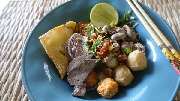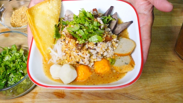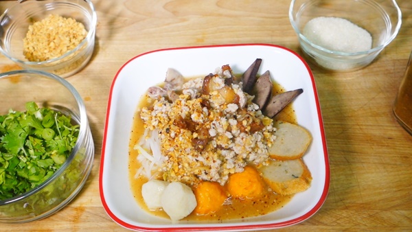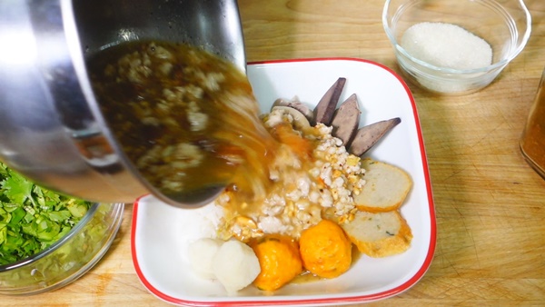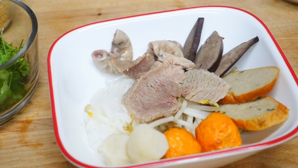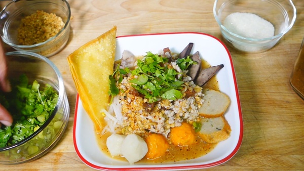 ทอดแผ่นเกี๊ยว ลวกลูกชิ้น หั่นหมูชิ้นเตรียมไว้ หั่นฮือก้วย ตับ ไส้อ่อน เตรียมไว้ด้วย แล้วแต่ชอบเลยค่ะ