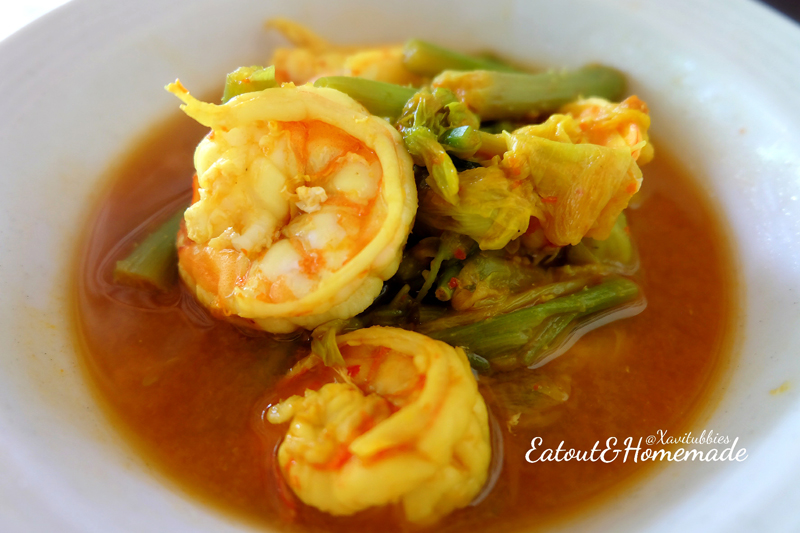 "แกงเหลืองดอกแคกับผักหนามใส่กุ้ง"
