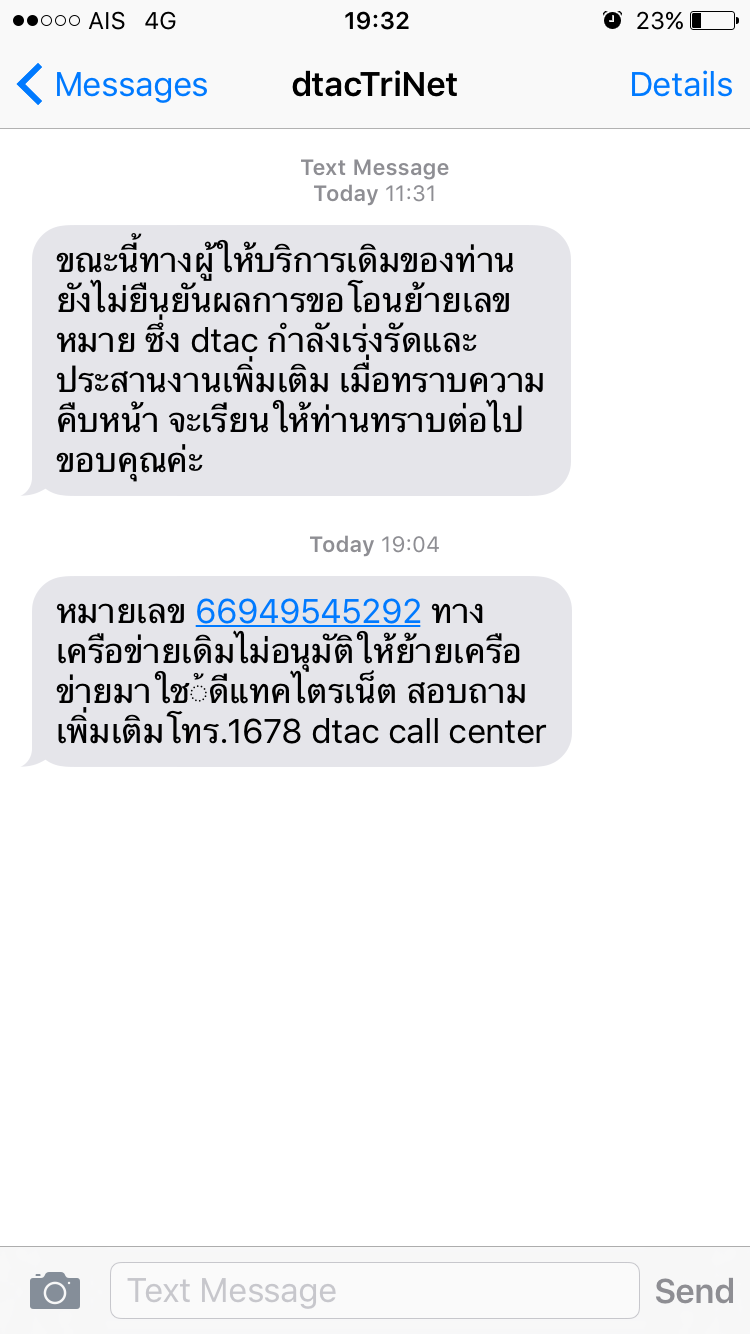 เบอร์ 09495452xx ผมได้ทำการยื่นเรื่องย้ายเครือข่ายไปตั้งแต่วันที่ 20/7/59 โดยในช่วงระยะเวลาที่ผ่านมา ผมได้ทำการติดตามเรื่องมาโดยตลอด ทั้งสอบถามการติดสัญญาการใช้บริการ โดยทาง ais ยืนยันว่าไม่ติดสัญญาใดๆ วันที่ 21 cc ais แจ้งผ่านทางหลังไมค์ว่าเบอร์ผมติดสัญญาการใช้บริการ ผมโทรเค้าไปสอบถาม จากนั้น จนท.บอกว่าจะส่งเรื่องปลดล็อคใหั คือล็อคอะไรครับ (ผมถามแล้วก็ขอให้ตอบตรงคำถามด้วย) วันที่ 22 ผมสอบถามไปอีกครั้งจากนั้น AIS1175 โทรว่าต้องการย้ายค่ายจริงๆใช่ไหม ผมตอบใช่ครับ จากนั้นก็วางสายไป วันที่ 23 cc ais บอกหลังไมค์อีกครั้งว่าจะย้ายไม่ได้เพราะติดสัญญาและจะทำให้ย้ายไม่ผ่าน คือตอบกลับไป วนมา ไม่รู้ว่าอะไรคือความจริงไม่จริง ผมก็เลยสอบถามไปยังดีแทค ดีแทคแจ้งว่ายังอยู่ในขั้นตอนโอนย้ายผลยังไม่ออก ais รู้ล่วงหน้าได้อย่างไร ? จนกระทั้งวันที่ 24 ais บอกให้รีบแจ้งดีแทคอีกครั้ง ตอนนี้ปลดล็อค(ซึ่งก็ไม่รู้ว่าล็อคอะไร) ให้แล้ว มีหลายเหตุผลเช่น เบอร์นี้อยู่ในระหว่างขอระงับบริการ/ไม่ชำระค่าบริการบ้าง/ไม่เบอร์นี้ในระบบบ้าง ซึ่งทุกๆวันผมก็ใช้เบอร์นี้ตลอด สุดท้ายที่วันที่ 25 ผลก็เป็นดั่ง sms จนป่านนี้ยังบอกว่า ติดล็อคสงสัย ขอส่งเรื่องตรวจสอบ ให้อีกครั้ง