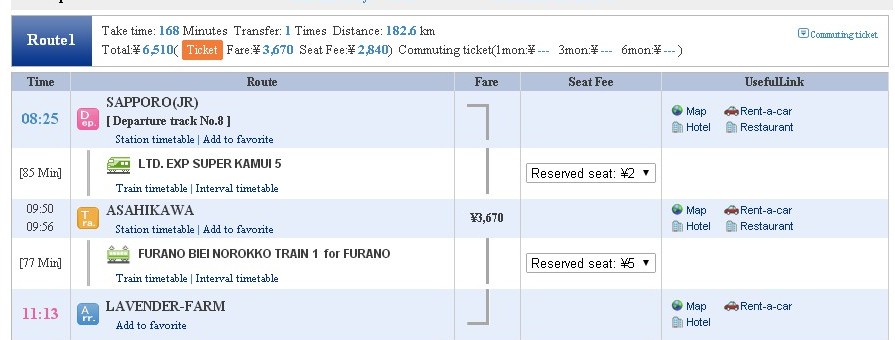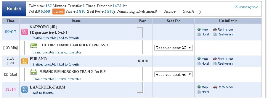 เริ่มจาการจองตั๋วก่อนครับ มาดูเที่ยวเดินทางก่อนนะครับ ดูได้จาก Web: www.hyperdia.com จาก Sapporo ไป lavender-farm (ถ้าจำไม่ผิดรถไฟเที่ยวนี้น่าจะมีเฉพาะช่วงเดือน กค.+- ครับ ต้องลองเช็คดู แนะนำให้จองก่อนนะครับ เพราะว่าเต็มไวมากกกกกกกกกๆๆๆๆๆๆๆๆๆๆๆๆๆ