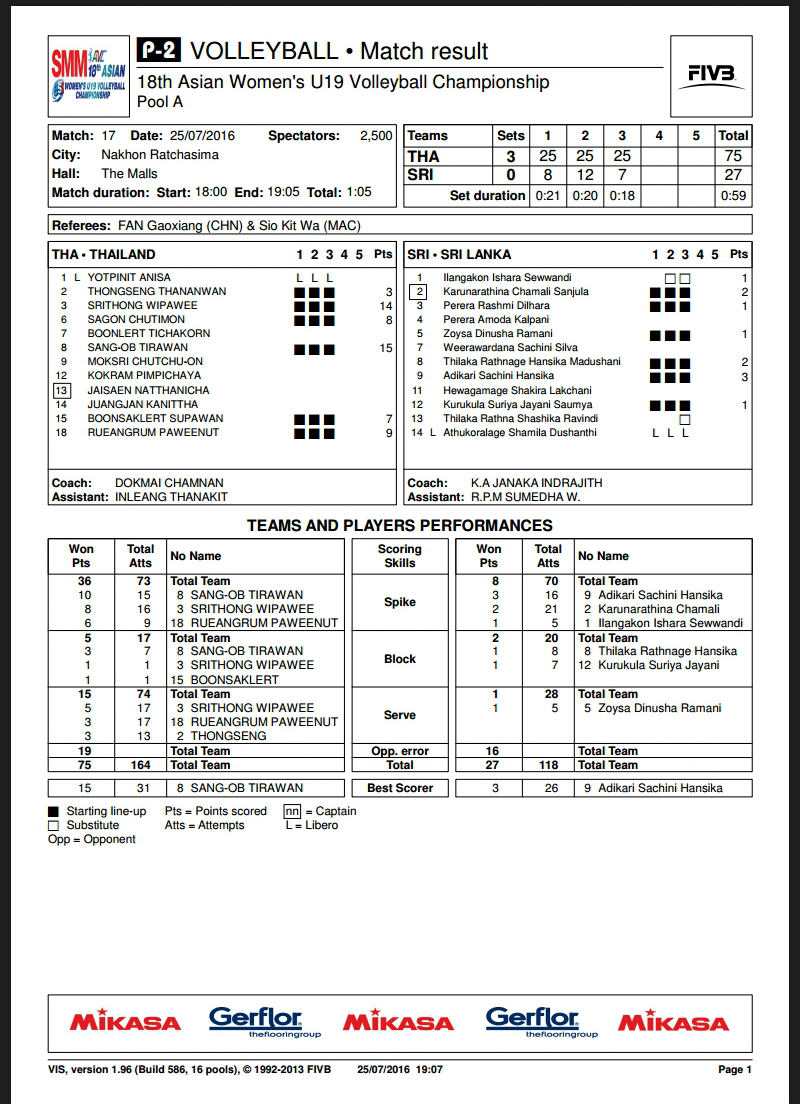 วอลเลย์บอลชาย : สถิติคู่ ไทย - ศรีลังกา