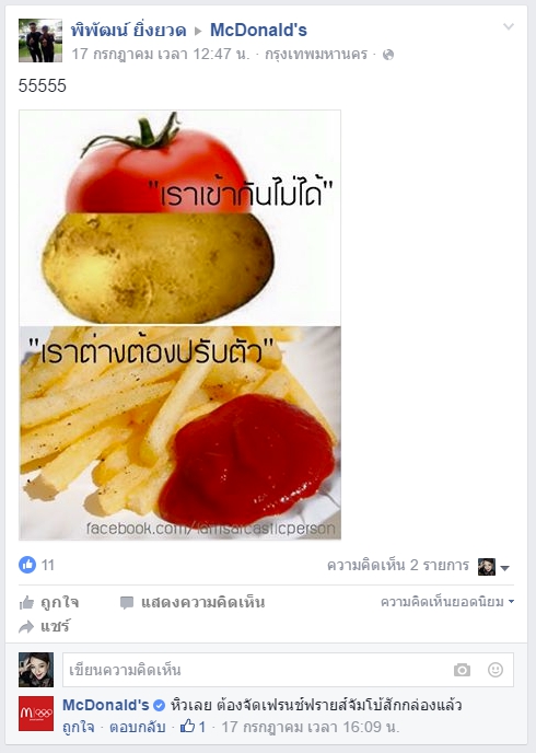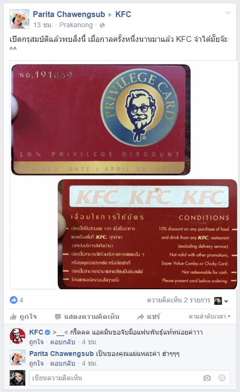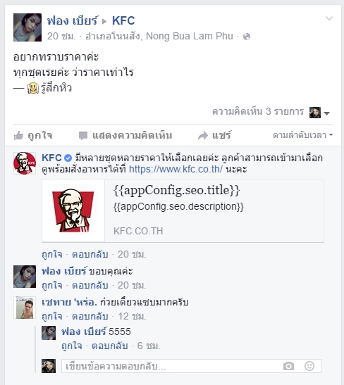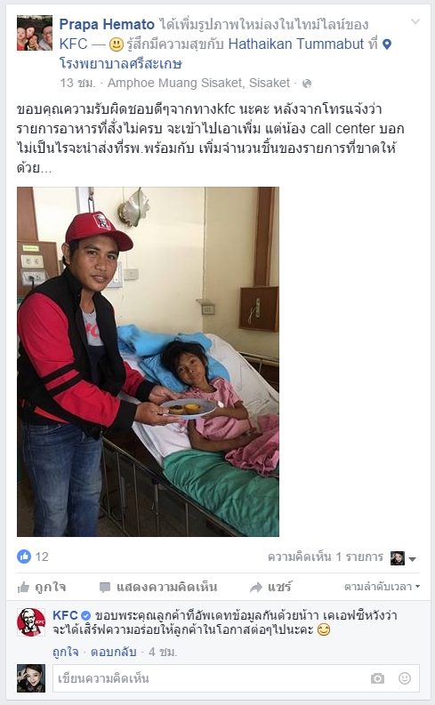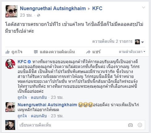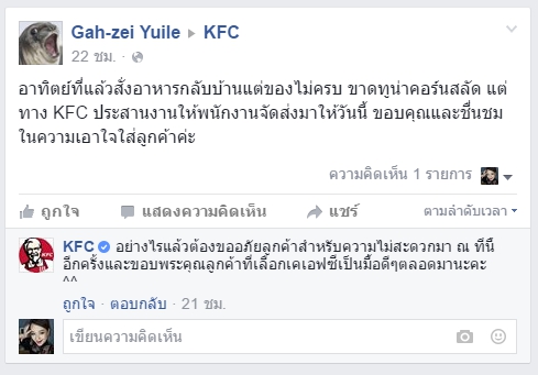 ล่าสุด วันนี้พี่โซ เข้าไปอ่านนที่ fanpage KFC ก็ประทับใจค่ะ คือ มีทั้งโพสที่ ลูกค้าตำหนิ, ลูกค้าชม, ลูกค้าเวิ่นเว้อลองภูมิ, ลูกค้าขอบคุณ