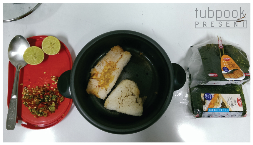 ขั้นตอนแรก แกะข้าวปั้นออกจากสาหร่าย (ขอบ่นหน่อยละกัน เดี๊ยนเป็นคนที่มีปัญหาทุกครั้ง ที่กินข้าวปั้น ไม่เคยได้กินข้าวคลุมสาหร่ายเลยค่ะ ต้องกัดข้าวคำ กัดสาหร่ายคำ เวลากินต้องกินแอบๆ อายเขาค่ะ) แล้วเอาข้าวปั้นไปนึ่งก่อนให้มันอ่อนตัวนิดนึง จะได้หนุบหนับ