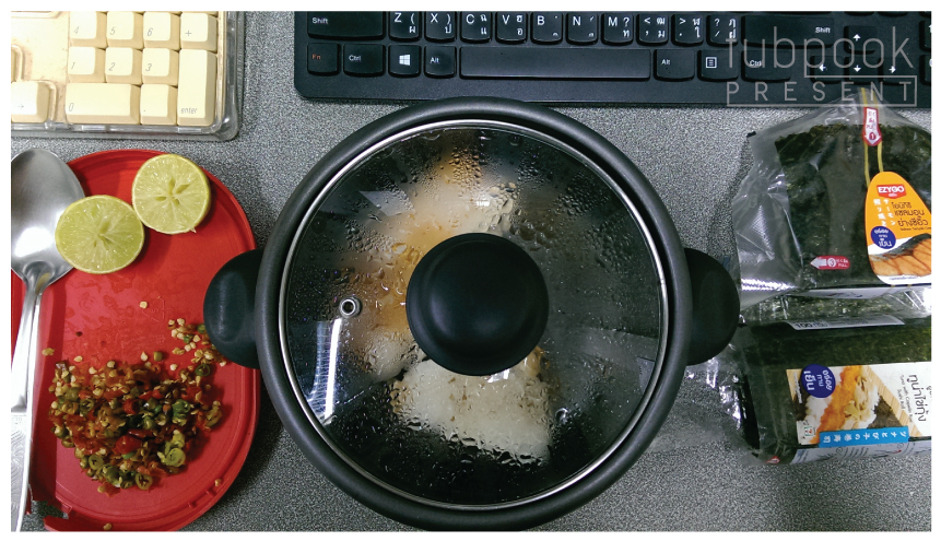 ออ...ลืมบอกค่ะว่า ทุกอย่างที่เกิดขึ้นทำในที่ทำงาน อุปกรณ์ก็ใช้เอาเท่าที่หาได้ในออฟฟิศ หรูสุดคือ กระทะไฟฟ้า ที่จับฉลากได้ตอนปีใหม่ของบริษัทฯที่ผ่านมาค่ะ