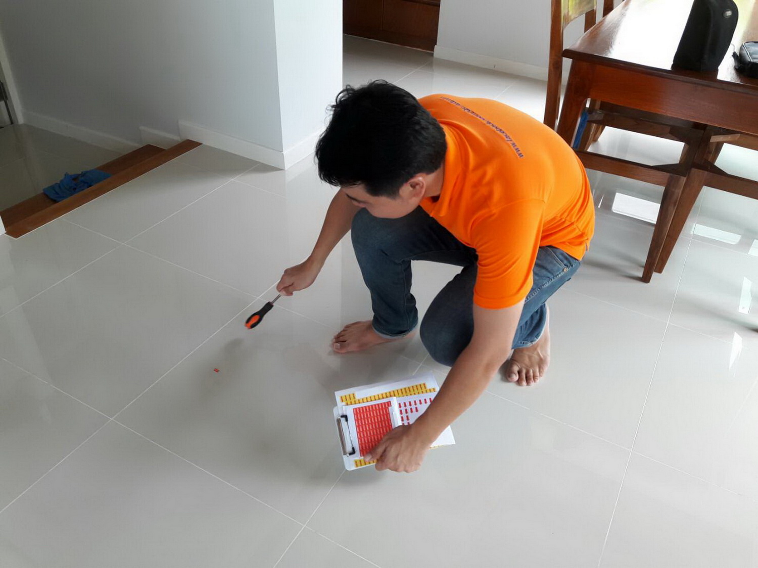 สักพักก็เข้ามาในบ้านยิ้มให้เราแล้วก็ เอาแต่เคาะไปตามกระเบื้อง ทีละแผ่น