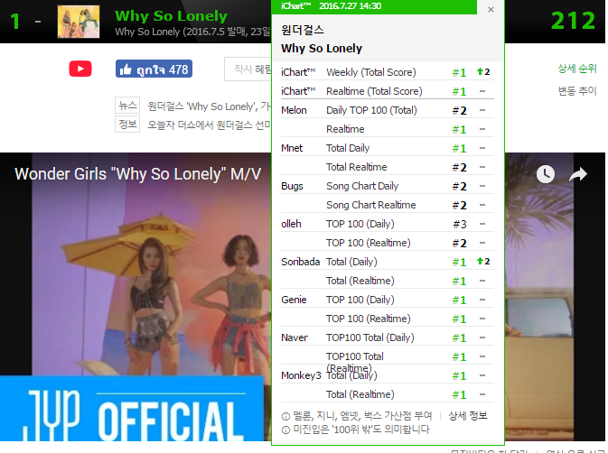 รายงานชาร์ตเพลง 4 ชาร์ตหลัก (07.07.2016) นับยอดตั้งแต่เที่ยงวัน 07/07 - เที่ยงวัน 08/07 Wonder Girls - Why So Lonely ********************************************** https://www.youtube.com/watch?v=PY