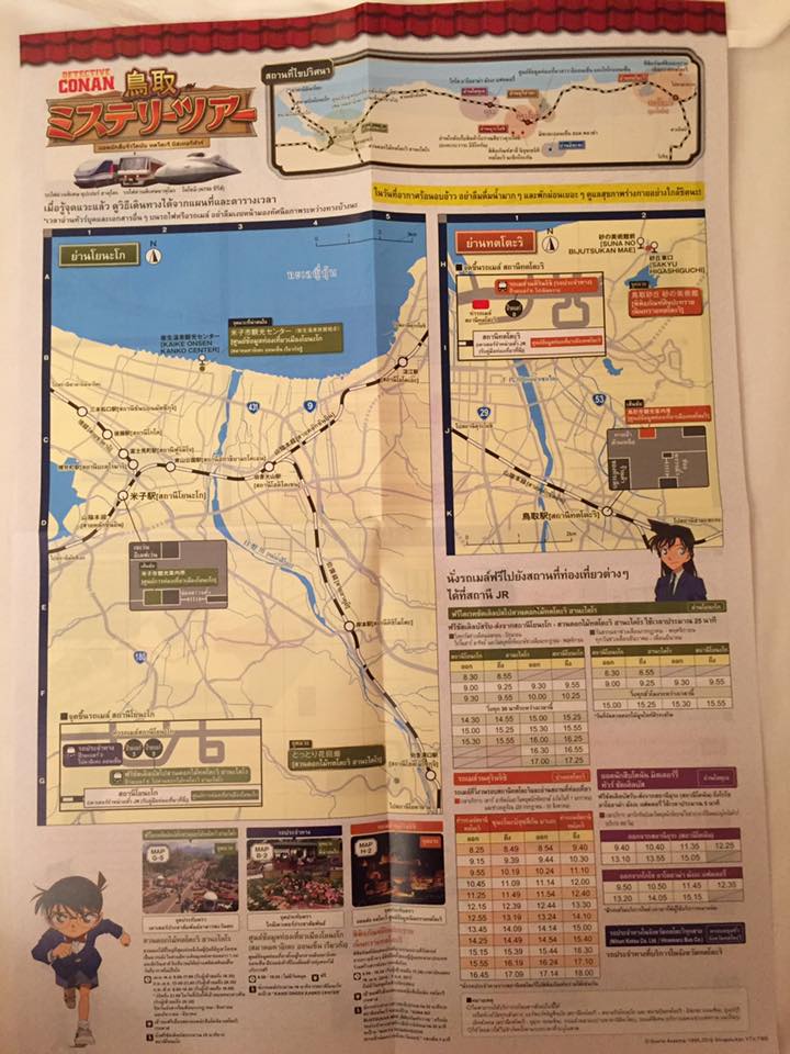 เป็นซองเชือกเหลืองๆทางขวามือนะคะ (ทางซ้ายเป็นโบชัวร์จิ๊กมาจากสนามบิน) ข้างในซองก็จะประกอบไปด้วยตั๋วรถไฟ (ใช้โชว์เวลาเดินทางไปไหนมาไหน) แล้วก็สมุด Guide Book นะคะ ข้างในก็จะมีเรื่องราวที่เกี่ยวกับคดี ที่เราจะต้องใช้มันสมอง ไขปริศนาให้ออกค่ะ เราได้มาก็ยังไม่ได้ดูรายละเอียดมากเท่าไหร่ เพราะเรามีแพลนจะเที่ยวทตโทริในวันที่สาม ก็เลยตั้งใจเที่ยวที่อื่นไป ก่อน เหะๆ