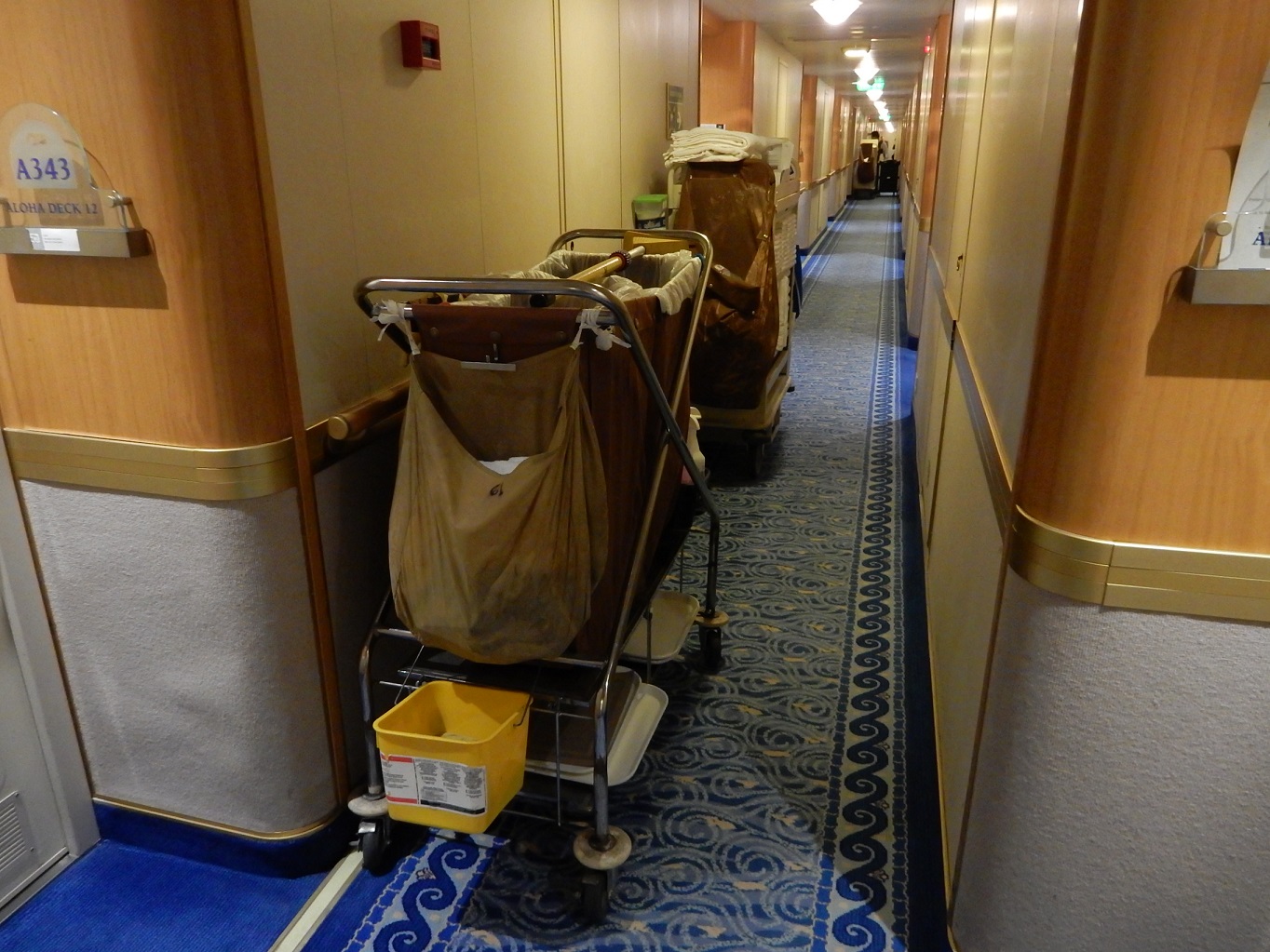 เริ่มต้นเช้าวันใหม่ วันนี้ไม่ต้องรีบร้อนอะไรเพราะต้องอยู่แต่ในเรือทั้งวัน เราเลยนอนพักผ่อนกันเต็มที่ตื่นซะสายเชียว พอออกจากห้องพักเราก็เจอรถเข็นอุปกรณ์ทำความสะอาดห้องพัก จอดอยู่ตามริมทางเดินหลายคัน เรือสำราญลำอื่นที่ผมเคยใช้บริการมา ล้วนแต่ใช้พนกงานทำความสะอาดแบบลึกลับ นั่นคือแอบเข้าไปทำความสะอาดห้องพักในช่วงเวลาที่เราไม่อยู่ในห้อง เดาว่าพนักงานคงแอบสังเกตว่าเราออกจากห้องพักตอนไหน