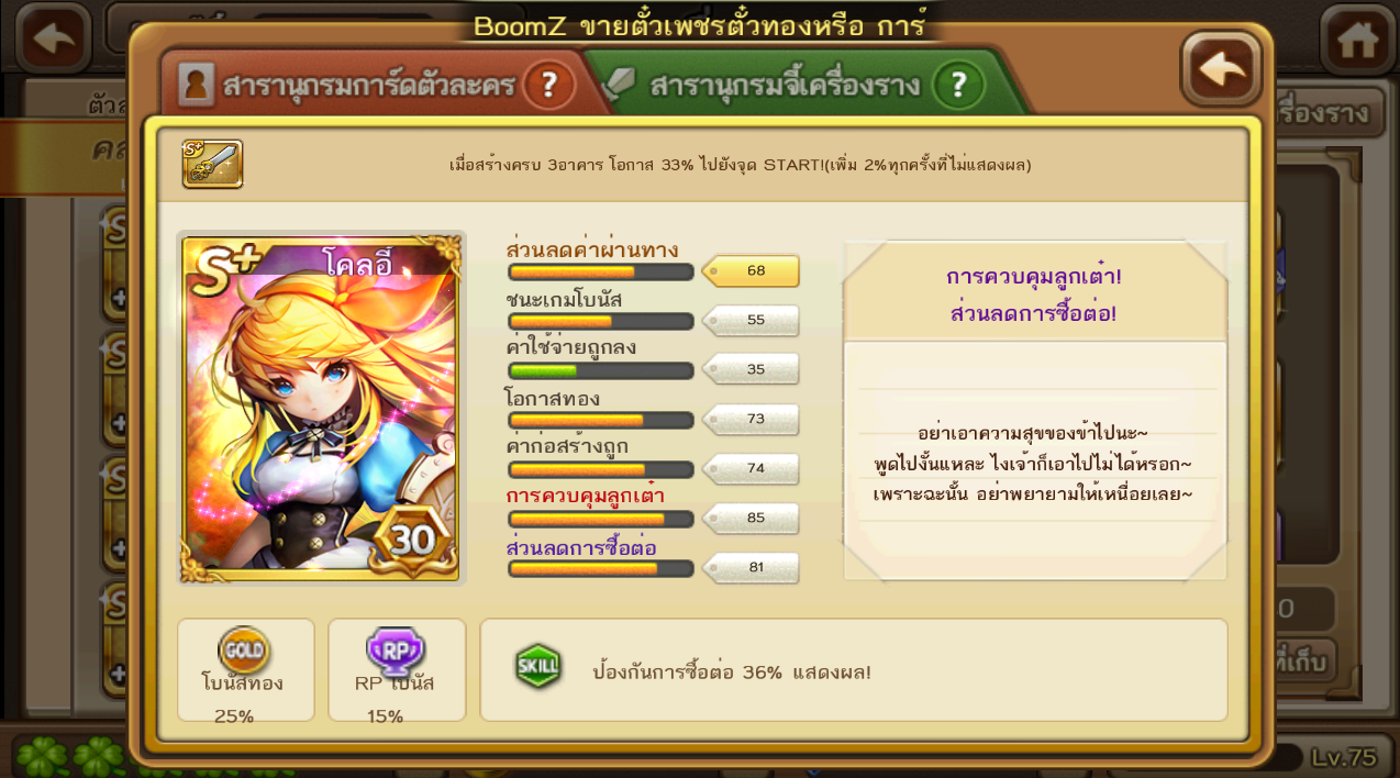 เพิ่งได้โคลอี้มา จากเว้นท์รวมการ์ด เป็นการ์ดที่อยากได้มาก เพราะพวกเล่นห้องแพลตชอบเอาไปเล่น แต่พอเอามาเล่นจริงๆ แปลนสร้างสามหลังไม่ออกเลยครับ เพิ่มทุก2% เพื่ออะไร สกิลกันซื้อต่อก็ไม่ออก สร้างไปสิบหลังก