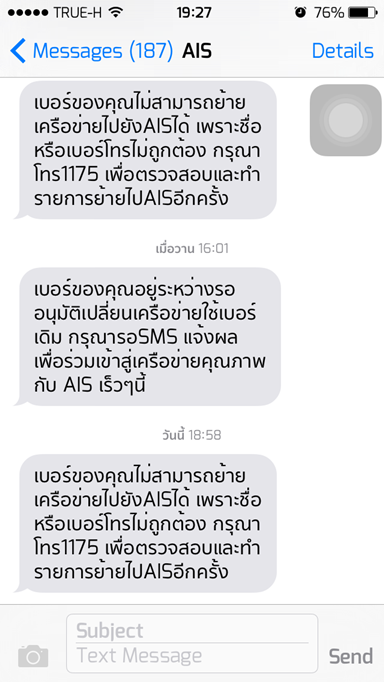 หลังจากอ่านและโทรไปที่ 1175 เพื่อสอบถาม ทางน้องจนท.บอกให้ผมไปตรวจสอบกับทางทรูก่อน ว่าข้อมูลทางนั้นถูกต้องมั้ย ผมจึงต่อโทรศัพท์ไป 1331 ทางจนท.ทรูได้ทำการสะกดชื่อ+นามสกุลให้ฟัง ซึ่งผมก็ยืนยันว่าถูกต้อง (ก็เอาจากบัตร ปชช) เมื่อได้เรื่องจึงโทรกลับไปเอไอเอสเพื่อทำการยืนยันโดยให้ทำการสะกดให้ฟังทั้งชื่อ+นามสกุล เบอร์โทรศัพท์ และเลขบัตร ปชช ผลคือ ก็ตรงกันทุกอย่าง (เพราะใช้บัตร ปชช ใบเดียวกัน) สรุปน้องจนท.บอกจะยื่นเรื่องให้อีกครั้ง ให้รอประมาณ 3-5 วันเหมือนเดิม ไอ้เราก็นึกว่าเรื่องจะจบ ที่ไหนได้ ผ่านไปวันเดียว ได้รับ SMS ฉบับใหม่ คราวนี้หัวร้อนเลย ไม่ทราบว่าจะอะไรกันนักหนาครับ