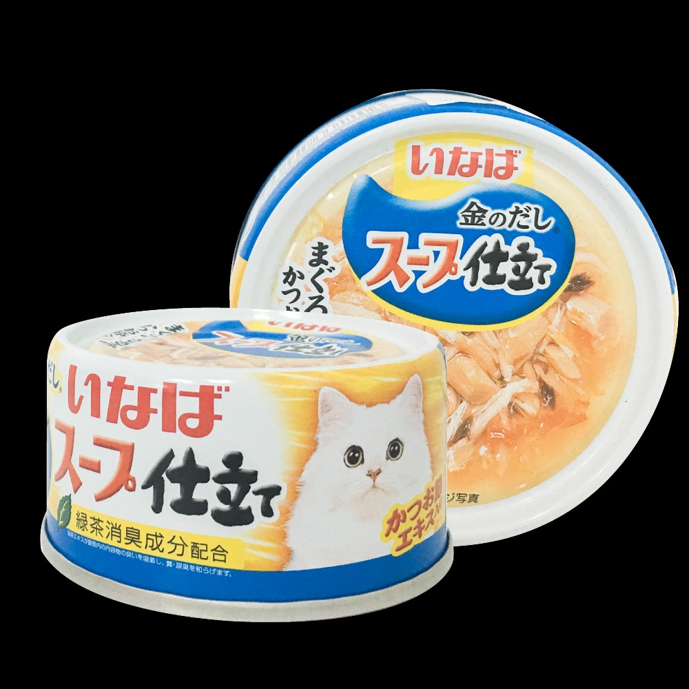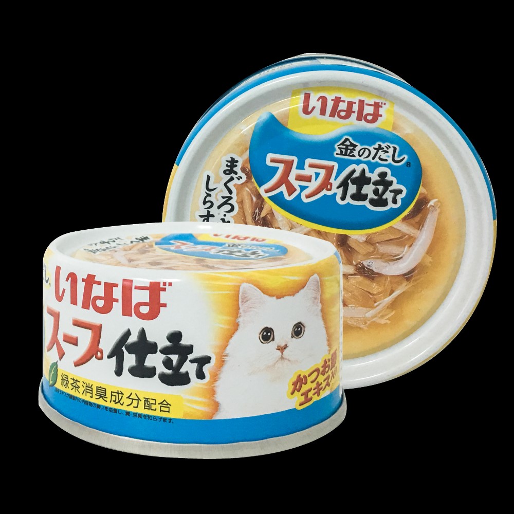 INABA Can รสปลาทูน่าเนื้อขาว และแดง ผสมเนื้อสันในไก่ในน้ำเกรวี่หน้าปลาโอแห้ง
