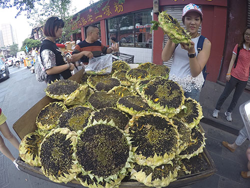 หน้าวัดมีเมล็ดทานตะวันขาย เพ่ยเพ่ยแวะซื้อ เรา 4 คน นี่ยังงงค่ะ ว่ามันคืออะไร ที่นี่เค้ากินเมล็ดทานตะวันกันสดๆนะคะ ไม่มีมาคั่วเหมือนบ้านเรา ดอกใหญ่มากกกกกค่า อาจุมม่าเลยซื้อมาสองดอก เพ่ยเพ่ยบอกให้ลองชิม แต่แล้วก็กินกันไม่ได้ค่า (สุดท้ายยกให้แม่ค้าร้านอาหารที่จิ่วจ้ายโกวไปกินค่ะ - -“)